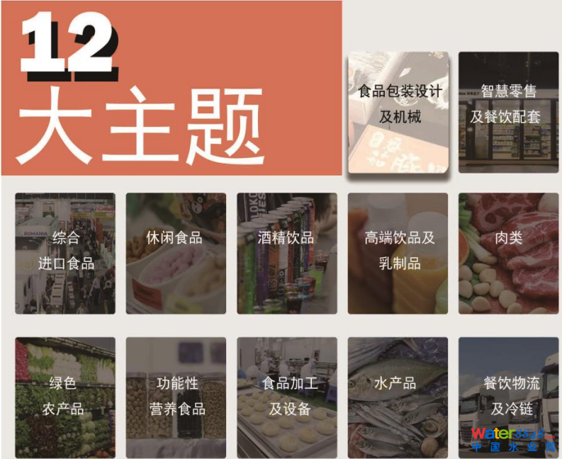 食品包裝設計及機械、智慧零售及餐飲配套、綜合進口食品、、休閑食品、酒精飲品、高端飲品及乳制品、肉類、功能性營養(yǎng)食品、綠色農產品、食品加工及設備、水產品、餐飲物流及冷鏈。
