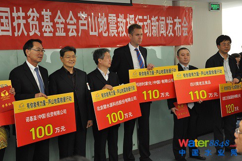 扶貧基金會(huì)蘆山地震救援行動(dòng)新聞發(fā)布會(huì)(左三為碧水源代表)