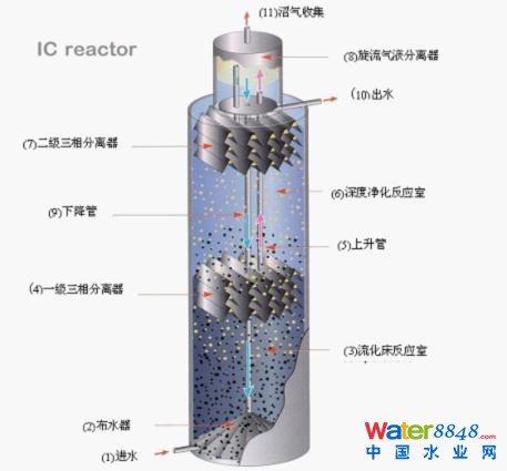 和傳統(tǒng)的厭氧反應器厭氧濾池(AF)、升流式厭氧污泥床(UASB)等不同,IC 反應器的構造特點是具有很大的高徑比,一般可達 4~8,反應器的高度可達 16~25m,具有較高的升流速度和較短的反應時間。
