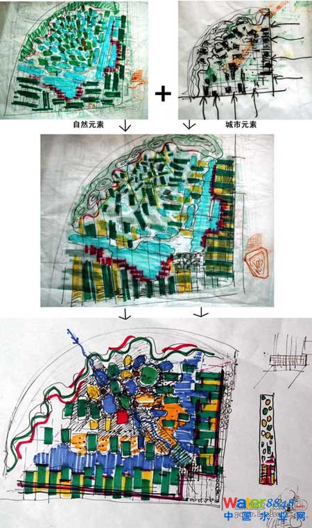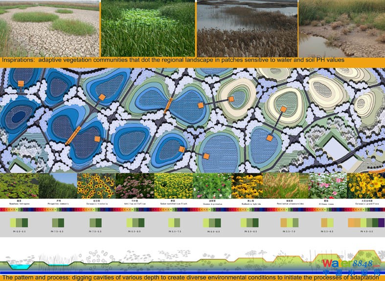 3 設計理念:讓自然工作。在不同的補丁有不同的水和土壤PH值,引發(fā)各自的生境適應過程。靈感來自于場地中棲息地斑塊的PH值對水的敏感性。