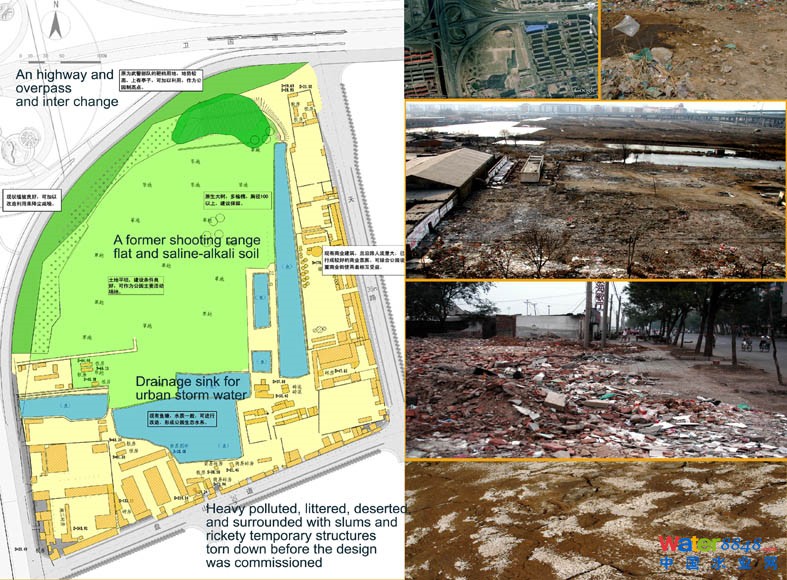 這是一個在天津的公園,場地被城市快速路包圍,是一塊垃圾遍布,收到污染,被人遺忘的區(qū)域,并且有相當嚴重的鹽堿地問題。2003年,天津市政府打算改造這里,并將這個艱巨的任務交到了景觀設計師手中。