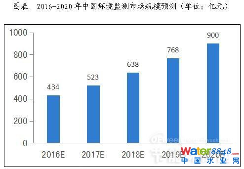 隨著國家對環(huán)境監(jiān)測行業(yè)的政策傾斜和資金投入加大,整個社會對環(huán)境問題的關(guān)注度提升,環(huán)境監(jiān)測站點增加以及環(huán)境監(jiān)測技術(shù)升級,環(huán)境監(jiān)測行業(yè)“十三五”期間將延續(xù)前幾年的行業(yè)景氣度,預(yù)測,2020年環(huán)境監(jiān)測行業(yè)市場規(guī)模有望突破900億元,五年復(fù)合增速約為20%左右。