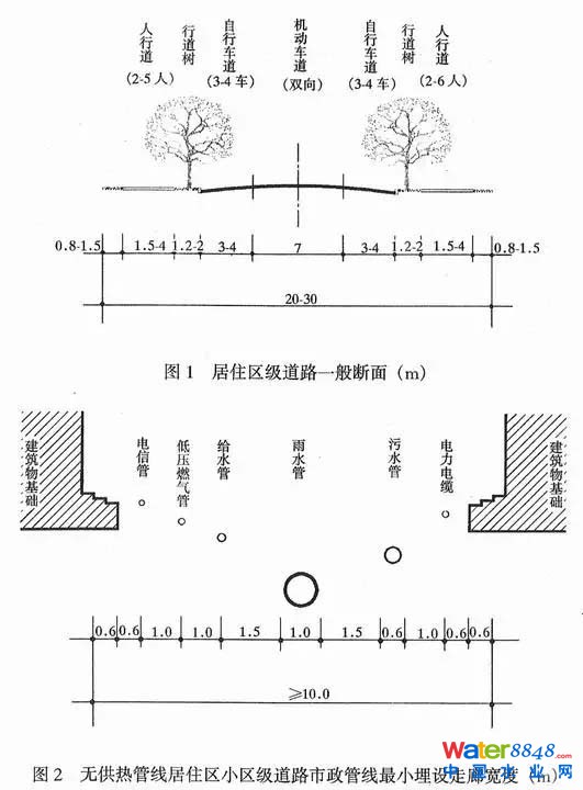 小區(qū)級(jí)道路車(chē)行道的最小寬度為6m,如兩側(cè)各安排一條寬度為1.5m的人行路,總寬度為9m,即可滿(mǎn)足一般功能需要。同時(shí),小區(qū)級(jí)道路往往又是市政管線(xiàn)埋沒(méi)的通道,在無(wú)供熱管線(xiàn)的居住區(qū)內(nèi),按六種基本管線(xiàn)的最小水平間距,它們?cè)诮ㄖ(xiàn)之間的最小極限寬度約為10m(圖2),此距離與小區(qū)級(jí)道路交通車(chē)行、人行所需寬度基本一致。