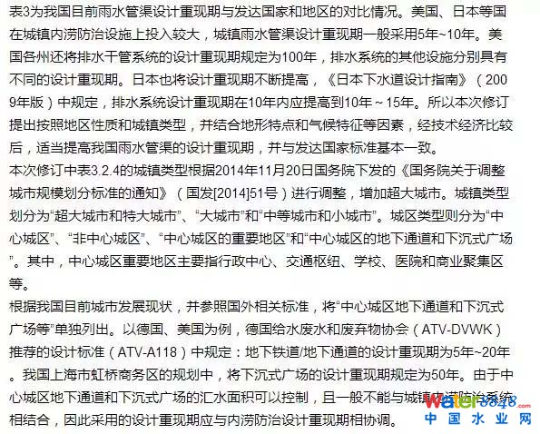 本次修訂的主要技術(shù)內(nèi)容是:在宗旨目的中補(bǔ)充規(guī)定推進(jìn)海綿城市建設(shè);補(bǔ)充了超大城市的雨水管渠設(shè)計(jì)重現(xiàn)期和內(nèi)澇防治設(shè)計(jì)重現(xiàn)期的標(biāo)準(zhǔn)等。