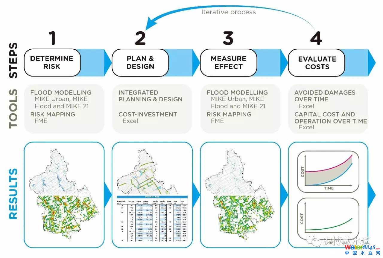 上述圖片展現(xiàn)了從風(fēng)險(xiǎn)確認(rèn)到建立修復(fù)計(jì)劃的迭代過(guò)程,并記錄了適應(yīng)效果。其結(jié)果被納入直接成本分析中,用于對(duì)比隨時(shí)間流逝所產(chǎn)生的投入并避免損失成本。假如該計(jì)劃的效果或成本未達(dá)到事先確定的標(biāo)準(zhǔn)或界限,那么便會(huì)重復(fù)進(jìn)行第2步以對(duì)設(shè)計(jì)和計(jì)劃作出相應(yīng)的調(diào)整。
