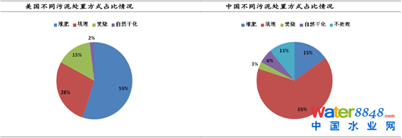 在2010年,從中美處置方法看,美國55%的污泥是用作土地利用,而中國目前還是以填埋為主。但是隨著技術(shù)手段的進(jìn)步,以及填埋場地的稀缺,未來綜合利用一定也將是我國污泥處置的方向。2010年數(shù)據(jù)如下,數(shù)據(jù)太老,僅做參考。
