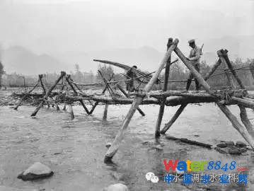 人們從臨時(shí)搭建的榪槎上行走(1934年)莊學(xué)本(中國(guó))攝 王國(guó)平 供圖