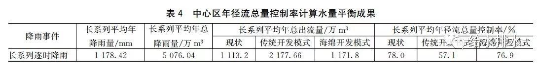 (2)模型法可有效模擬城市開(kāi)發(fā)建設(shè)前、傳統(tǒng)開(kāi)發(fā)模式、海綿城市開(kāi)發(fā)模式3種狀態(tài)下,各地塊的總出流量,得出總降雨控制量,匯總得到中心區(qū)的年徑流總量控制率。從模擬結(jié)果來(lái)看,中心區(qū)在傳統(tǒng)開(kāi)發(fā)模式下,年徑流總量控制率將從現(xiàn)狀未開(kāi)發(fā)狀態(tài)的78%下降到57.1%,若以海綿城市建設(shè)規(guī)劃中的指標(biāo)為地塊開(kāi)發(fā)建設(shè)依據(jù),年徑流總量控制率將提高到76.9%,與城市開(kāi)發(fā)前基本保持一致,實(shí)現(xiàn)了城市開(kāi)發(fā)建設(shè)前后,水文條件基本一致。