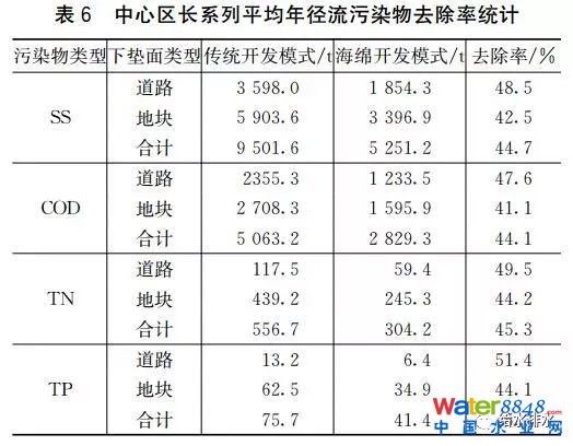 海綿開(kāi)發(fā)模式將因地制宜采取多種低影響措施進(jìn)行建設(shè),為便于比較,將傳統(tǒng)開(kāi)發(fā)模式作為采取海綿開(kāi)發(fā)模式前的本底條件的估計(jì)。根據(jù)控規(guī)確定的城市用地布局,分別統(tǒng)計(jì)道路和地塊的傳統(tǒng)開(kāi)發(fā)模式、海綿城市開(kāi)發(fā)模式(即LID)下的年徑流污染物總量,以及海綿城市開(kāi)發(fā)模式相對(duì)傳統(tǒng)開(kāi)發(fā)模式的各項(xiàng)污染物去除率,見(jiàn)表6。