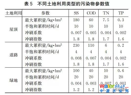 依據(jù)1991~2016年逐時(shí)連續(xù)降雨系列,利用貴安新區(qū)中心區(qū)海綿城市模型體系中的產(chǎn)污模塊,以SS、COD、TN、TP 4種污染物質(zhì)為對(duì)象進(jìn)行徑流污染控制模擬。其中,污染物累積模型選擇飽和函數(shù)累積模型,污染物沖刷模型選擇指數(shù)沖刷模型,參考本地以往相關(guān)研究結(jié)果及相鄰相似區(qū)域經(jīng)驗(yàn),本次計(jì)算的累積及沖刷參數(shù)取值見(jiàn)表5。