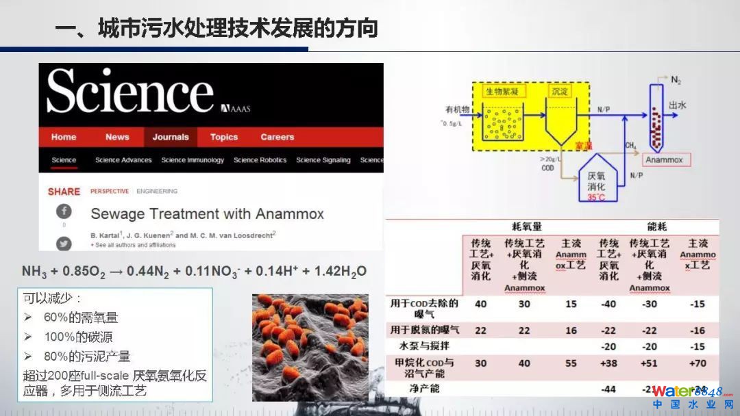 在本世紀初,污水處理領(lǐng)域有兩個非常著名的發(fā)現(xiàn):第一個是厭氧氨氧化,第二個是好氧顆粒污泥,這給污水處理的發(fā)展帶來非常大的變數(shù)。好氧顆粒污泥和厭氧氨氧化實際已經(jīng)有一二十年的歷史,但是一直沒有引起足夠的關(guān)注。對于厭氧氨氧化的研究,荷蘭代爾夫特理工大學(xué)的Mark教授在《Science》上發(fā)表了一篇文章,認為厭氧氨氧化可以使污水處理廠達到凈的產(chǎn)能,這就給污水處理廠下一步的發(fā)展指明了一條道路。