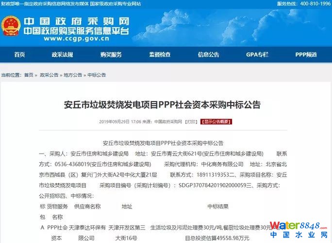 環(huán)衛(wèi)科技網(wǎng)訊,9月29日,中國政府采購網(wǎng)發(fā)布安丘市垃圾焚燒發(fā)電項目PPP社會資本采購中標公告。