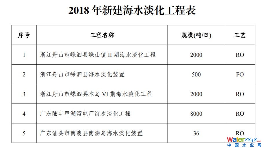 數(shù)據(jù)顯示,2018年,全國(guó)新建成海水淡化工程5個(gè),新增規(guī)模為日均1.25萬(wàn)噸,分布在浙江和廣東,主要用于海島生活用水和沿海城市工業(yè)用水。全國(guó)已建成萬(wàn)噸級(jí)及以上海水淡化工程36個(gè),已建成的最大海水淡化工程單體規(guī)模為日均20萬(wàn)噸。