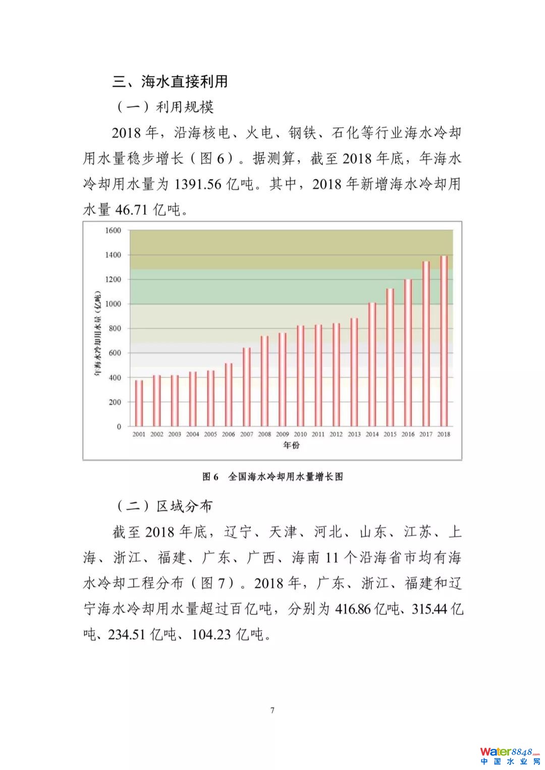 報(bào)告顯示,2018年,中國(guó)沿海核電、火電、鋼鐵、石化等行業(yè)海水冷卻用水量穩(wěn)步增長(zhǎng)。據(jù)測(cè)算,截至2018年底,年海水冷卻用水量為1391.56億噸。其中,2018年新增海水冷卻用水量46.71億噸。