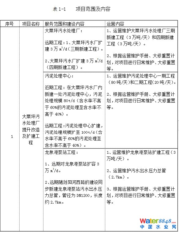 瀏陽(yáng)市城鎮(zhèn)生活污水處理提質(zhì)增效PPP項(xiàng)目合作范圍包括:大栗坪污水處理廠提升改造及擴(kuò)建工程、雨污分流工程、智慧水務(wù)及鄉(xiāng)鎮(zhèn)污水處理提質(zhì)增效工程。項(xiàng)目分近期和遠(yuǎn)期工程,其中近期工程在2020年至2023年實(shí)施,遠(yuǎn)期工程自2024年開(kāi)始實(shí)施。項(xiàng)目公司可根據(jù)調(diào)研結(jié)果和實(shí)際需求調(diào)整建設(shè)內(nèi)容和規(guī)模,實(shí)施階段管網(wǎng)改造和新建工程將根據(jù)地勘情況、拆遷、城市規(guī)劃要求等做適當(dāng)調(diào)整。污水出水標(biāo)準(zhǔn)可根據(jù)政府要求,按照湖南省最新標(biāo)準(zhǔn)要求進(jìn)行適當(dāng)調(diào)整。項(xiàng)目實(shí)施范圍和內(nèi)容最終以經(jīng)政府方審批通過(guò)的初步設(shè)計(jì)及批復(fù)文件為準(zhǔn)。項(xiàng)目總預(yù)算為119482.78萬(wàn)元,項(xiàng)目具體內(nèi)容見(jiàn)下表1-1,項(xiàng)目投資組成表見(jiàn)表1-2