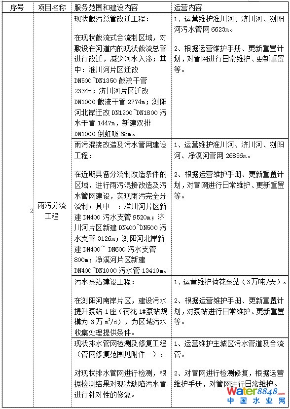 瀏陽(yáng)市城鎮(zhèn)生活污水處理提質(zhì)增效PPP項(xiàng)目合作范圍包括:大栗坪污水處理廠提升改造及擴(kuò)建工程、雨污分流工程、智慧水務(wù)及鄉(xiāng)鎮(zhèn)污水處理提質(zhì)增效工程。項(xiàng)目分近期和遠(yuǎn)期工程,其中近期工程在2020年至2023年實(shí)施,遠(yuǎn)期工程自2024年開(kāi)始實(shí)施。項(xiàng)目公司可根據(jù)調(diào)研結(jié)果和實(shí)際需求調(diào)整建設(shè)內(nèi)容和規(guī)模,實(shí)施階段管網(wǎng)改造和新建工程將根據(jù)地勘情況、拆遷、城市規(guī)劃要求等做適當(dāng)調(diào)整。污水出水標(biāo)準(zhǔn)可根據(jù)政府要求,按照湖南省最新標(biāo)準(zhǔn)要求進(jìn)行適當(dāng)調(diào)整。項(xiàng)目實(shí)施范圍和內(nèi)容最終以經(jīng)政府方審批通過(guò)的初步設(shè)計(jì)及批復(fù)文件為準(zhǔn)。項(xiàng)目總預(yù)算為119482.78萬(wàn)元。