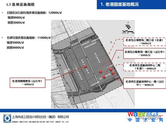 老港固體廢棄物綜合利用基地位于上海浦東,距中心城區(qū)約70公里。它承擔了上海70%的生活垃圾末端處置任務。老港基地東面靠海,北面、南面以及西側(cè)分別留有1km寬度的建設(shè)控制區(qū),整個老港規(guī)劃面積29.5平方米,建設(shè)實施區(qū)15.3平方公里,控制區(qū)14.2平方公里。本次演講主要分享的是老港固廢基地里面跟滲濾液處理有關(guān)的項目,目前基地中在運行的垃圾處置設(shè)施規(guī)模達到12900噸/天,其中填埋是9900噸/天,焚燒為3000噸/天。在建垃圾處置設(shè)施規(guī)模為11000噸/天,其中填埋為5000噸/天,焚燒為6000噸/天。