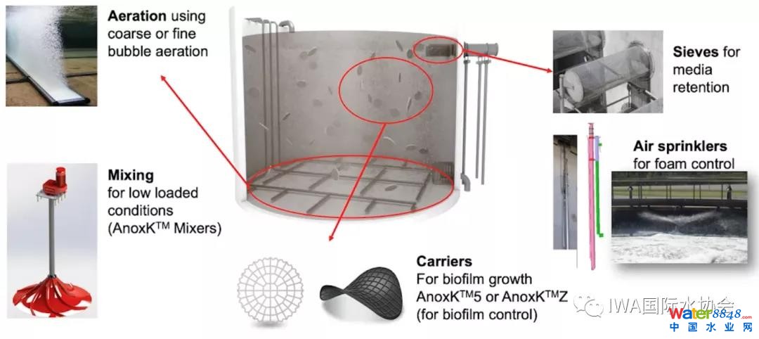 在Christensson先生看來,ANITA Mox的成功離不開反應(yīng)器的細(xì)節(jié)設(shè)計(jì),其中包括了曝氣、攪拌、載體、anammox菌截留器、泡沫控制等。五部分的對(duì)應(yīng)設(shè)備如下圖所示。