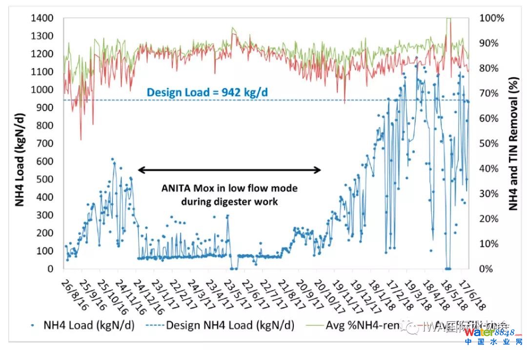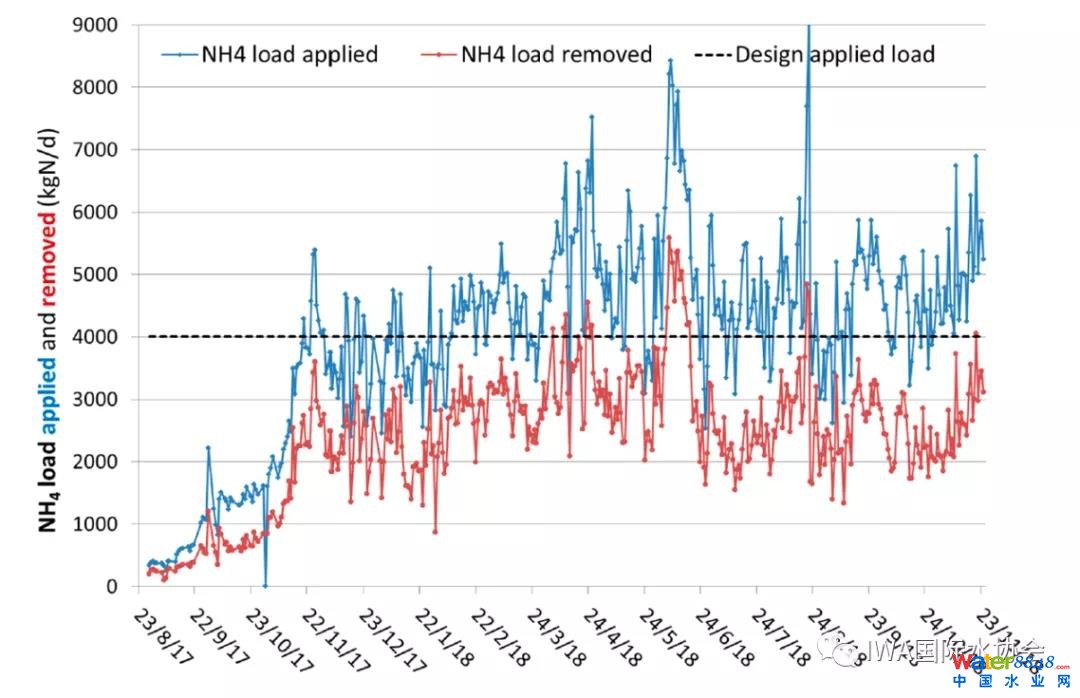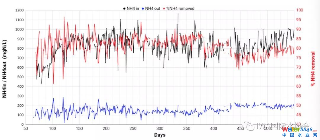 盡管這個(gè)項(xiàng)目的接種比只有5%,但啟動(dòng)時(shí)間僅需要13周。此外,在這個(gè)案例里,工程團(tuán)隊(duì)遇到了實(shí)際負(fù)荷超過設(shè)計(jì)負(fù)荷、進(jìn)水流量波動(dòng)、聚合物殘留多、高TSS沖擊等影響。該污水廠的目標(biāo)負(fù)荷是設(shè)計(jì)負(fù)荷的120-150%,出水氨氮在200-300mgN/L之間,這使得氨氮的實(shí)際去除率僅為67-75%。但這是在沒有投加額外堿度的情況下完成的。ANITA Mox的出水則通過剩下的回流污泥曝氣池做進(jìn)一步處理。