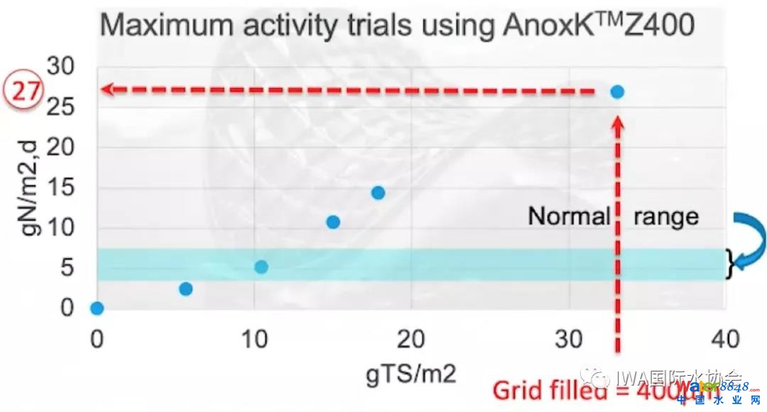 他特別提到了載體和截留篩筒的作用,實(shí)驗(yàn)數(shù)據(jù)顯示,如果在理想條件下,使用生物膜厚度為400μm的載體,加上有足夠的氨氮和亞硝態(tài)氮,載體面積的氨氮去除率可達(dá)27g/㎡/d,是實(shí)際單位去除效率的5倍多。當(dāng)然在現(xiàn)實(shí)中這是不可能的,因?yàn)闊o法提供這么多的亞硝態(tài)氮。但另一方面,這說明現(xiàn)在的載體處理能力已經(jīng)是過剩的,這意味著在未來,他們會(huì)嘗試減少載體的比例,提供更多的空間用以AOB轉(zhuǎn)化氨氮。
