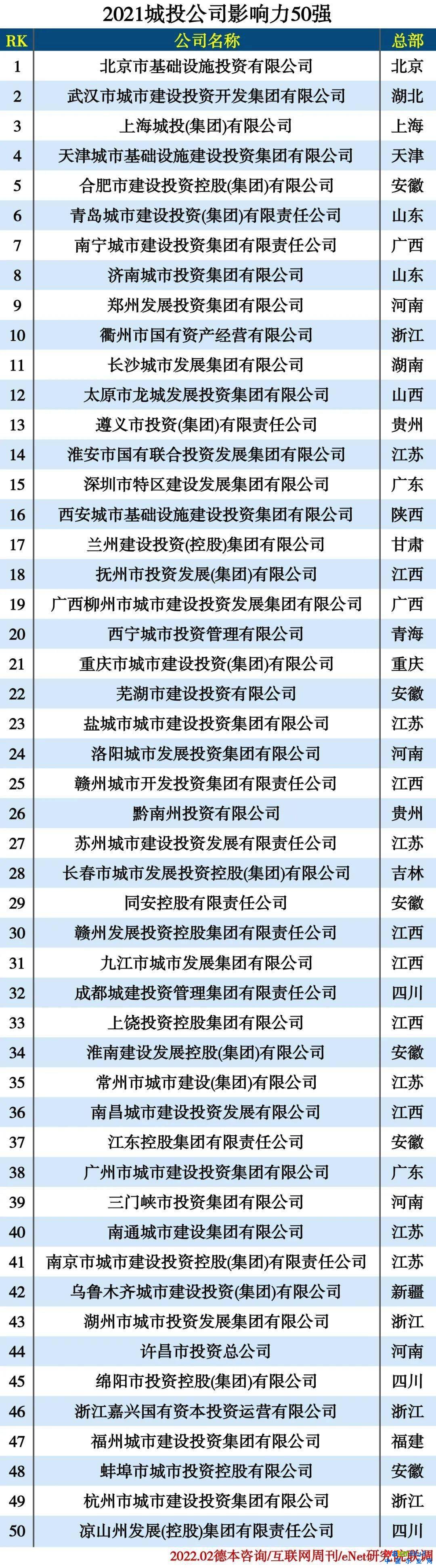 日前,由德本咨詢、互聯(lián)網(wǎng)周刊、eNet研究院聯(lián)調(diào)并發(fā)布了“2021城投公司影響力5 0強(qiáng)”排行榜,北京市基礎(chǔ)實(shí)施投資有限公司名列榜首、 武漢市城市建設(shè)投資開發(fā)集團(tuán)排名第二、上海城投集團(tuán)為第三,天津城市基礎(chǔ)設(shè)施建設(shè)投資集團(tuán)和合肥市建設(shè)投資控股集團(tuán)分別名列第四和第五。