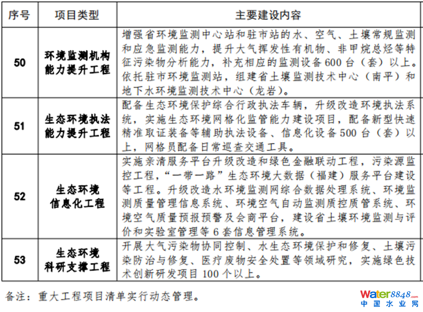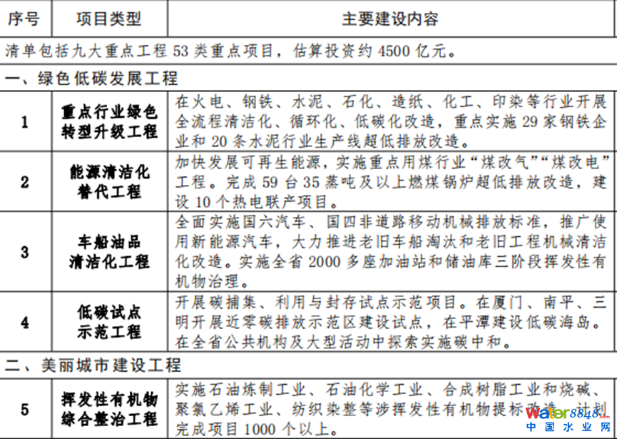 其中去年10月發(fā)布的《福建省“十四五”生態(tài)環(huán)境保護(hù)專項(xiàng)規(guī)劃》(以下簡(jiǎn)稱《規(guī)劃》)中,列出了福建省“十四五”生態(tài)環(huán)境保護(hù)重大工程項(xiàng)目清單,清單包括九大重點(diǎn)工程 53 類重點(diǎn)項(xiàng)目,估算投資約 4500 億元。