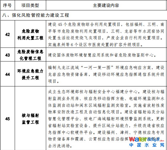 建設(shè)45個(gè)危險(xiǎn)廢物綜合利用處置項(xiàng)目,包括福州、三明、南平等市危險(xiǎn)廢物利用處置項(xiàng)目,三明、龍巖等市水泥窯協(xié)同處置生活垃圾焚燒飛灰項(xiàng)目,產(chǎn)廢企業(yè)自行利用處置項(xiàng)目。實(shí)施泉州等6個(gè)設(shè)區(qū)市醫(yī)廢處置的擴(kuò)容升級(jí)項(xiàng)目。