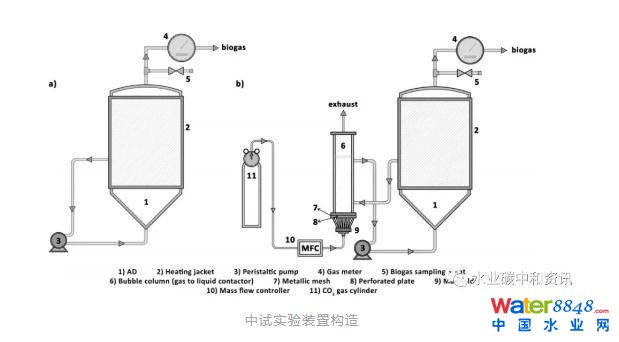 眾所周知,CO2是在消化過程中伴隨著甲烷產(chǎn)生的產(chǎn)物。而另一方面,利用厭氧消化進(jìn)行CO2捕集固定是一種潛力十足的碳減排策略。兩個(gè)處理食品垃圾的厭氧消化試驗(yàn)進(jìn)行了225 d監(jiān)測(cè),實(shí)驗(yàn)組定期使用氣泡柱充入CO2(Fernandez et al.)。實(shí)驗(yàn)組測(cè)試CH4產(chǎn)率為0.56±0.13 m3CH4/kgVS·d(對(duì)照組為0.45±0.05 )沼氣中CH4濃度為68%,額外攝取了外源CO20.55 kg,H2濃度增加了2.5 倍,這歸因于CO2溶解以及酸化與產(chǎn)氫途徑改變。