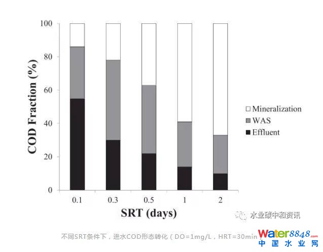 高負(fù)荷活性污泥法(High-rate activatedsludge, HRAS)(如A/B工藝中的A段)經(jīng)常用于從污水中高效分離有機(jī)物,繼而將之用于能源再生。一座HRAS試驗(yàn)裝置運(yùn)行于寒冷溫度下。通過最大化提高污泥量、細(xì)菌量和生物絮凝作用,可以以最少能量輸入將進(jìn)水中顆粒、膠體和溶解性COD集于廢物固體流中(Jimenez et al.)。結(jié)果表明,SRT、HRT和DO等重要的設(shè)計(jì)參數(shù)對(duì)去除COD影響不大。因此,控制并最大程度地去除膠體和顆粒COD,盡量減慢生物降解COD的礦化和水解作用,是碳重新定向之關(guān)鍵。在較SRT和HRT下運(yùn)行時(shí),產(chǎn)量接近其最大值,因而可在接近最大污泥產(chǎn)率情況下,可最優(yōu)地利用COD產(chǎn)出生物質(zhì)。在這些運(yùn)行條件下,與傳統(tǒng)HRAS工藝相比,其去除大部分(50~80%)進(jìn)水COD時(shí)所需求的曝氣量減少近60%。