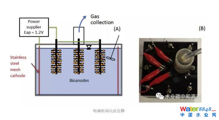 亦可以通過微生物燃料電池(MEC)等創(chuàng)新技術(shù)刺激反應(yīng)器中甲烷產(chǎn)生。應(yīng)用電輔助消化(EAD:裝備有MEC生物陽極和陰極)和控制消化技術(shù),在室溫(22~23℃)和3個(gè)SRT(7、10、14 d)條件下,處理來自于市政污水處理廠的活性污泥(Asztalos and Kim)。EAD 顯示乙酸、丙酸、正丁酸、異丁酸濃度減少,認(rèn)為這是由于在生物陽極直接氧化短鏈脂肪酸,同時(shí)低乙酸濃度強(qiáng)化氧化的間接貢獻(xiàn)。在所有條件下,EAD中VSS和COD的去除率均比對(duì)照組高5 ~10%。此外,EAD中電流的大小受有機(jī)負(fù)荷率影響,而導(dǎo)電性和乙酸濃度對(duì)其影響則微乎其微。