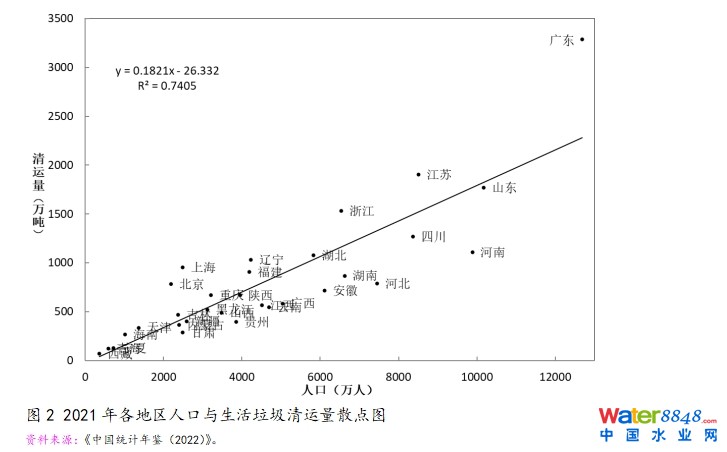 我國是人口大國,生活垃圾產(chǎn)生量大,居世界首位。2021年,我國城市生活垃圾清運量為2.5億噸,如果加上0.7億噸縣城生活垃圾清運量,生活垃圾處理量達到3.2億噸。生活垃圾處理量與人口數(shù)量和經(jīng)濟發(fā)展水平正相關(guān)。人口越多、經(jīng)濟越發(fā)達,生活垃圾產(chǎn)生量越多。從2021年各地區(qū)人口數(shù)量與垃圾清運量散點圖來看,平均每增加1人生活垃圾清運量增加181千克。廣東、江蘇、浙江、北京和上海等經(jīng)濟發(fā)達地區(qū)生活垃圾清運量偏多,而河南、四川、河北與安徽等地區(qū)的生活垃圾清運量要低于全國平均水平。北京和上海人均生活垃圾清運量最高,分別為358千克和384千克,遠高于其他地區(qū)。
