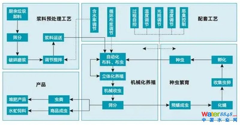黑水虻處理廚余垃圾的工藝。第一步,廚余垃圾預處理,對廚余垃圾進行過濾、分選、粉碎和堆放;第二步,接種幼蟲,將預處理后的廚余垃圾平鋪在垃圾處理箱中,然后將黑水虻蟲卵孵化后的幼蟲接入到廚余垃圾中;第三步,料蟲分離,將養(yǎng)殖處理完成后的黑水虻熟幼蟲和蟲糞收集和分離。