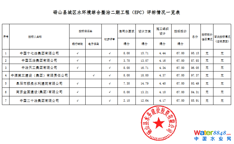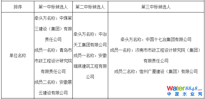5月10日,宿州市公共資源交易中心發(fā)布碭山縣城區(qū)水環(huán)境綜合整治二期工程(EPC)中標(biāo)候選人公示,第一中標(biāo)候選人為中煤第三建設(shè)(集團(tuán))有限責(zé)任公司、青島市市政工程設(shè)計(jì)研究院有限責(zé)任公司、安徽展云建設(shè)有限公司聯(lián)合體。