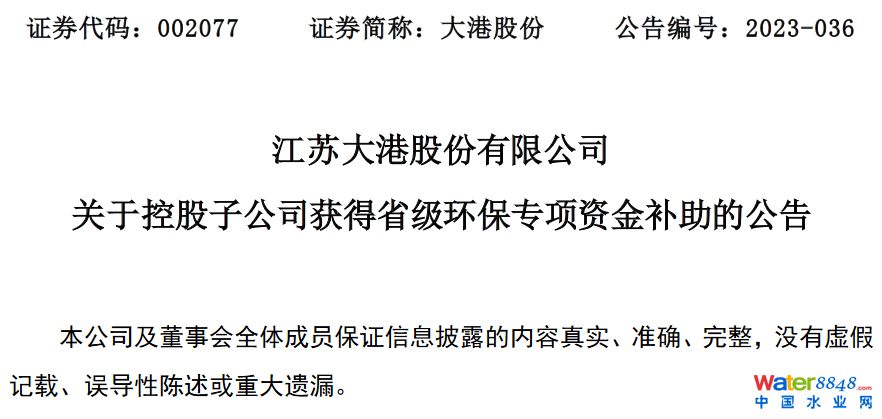 大港股份(002077)于6月5日發(fā)布晚間公告稱,江蘇大港股份有限公司(以下簡稱“公司”)控股子公司鎮(zhèn)江新區(qū)固廢處置股份有限公司(以下簡稱“新區(qū)固廢”)于近日收到鎮(zhèn)江新區(qū)生態(tài)環(huán)境和應(yīng)急管理局《關(guān)于撥付 2021 年度省級(jí)環(huán)保專項(xiàng)資金的函》,根據(jù)《鎮(zhèn)江市市級(jí)環(huán)境保護(hù)專項(xiàng)資金管理辦法》(鎮(zhèn)財(cái)規(guī)[2011]7 號(hào))、《關(guān)于下達(dá) 2021 年度省生態(tài)環(huán)境保護(hù)專項(xiàng)資金的通知》(鎮(zhèn)財(cái)建[2021]96 號(hào))等相關(guān)文件及 2021 年環(huán)境保護(hù)專項(xiàng)資金支持的原則和范圍,新區(qū)固廢所屬鎮(zhèn)江新區(qū)危險(xiǎn)廢物安全填埋處置二期項(xiàng)目獲得 547.85 萬元資金補(bǔ)助。