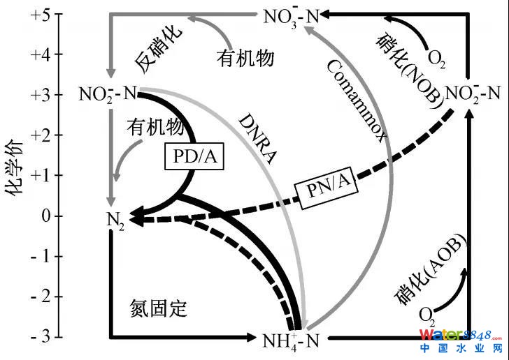 圖2 厭氧氨氧化工藝相關(guān)的氮素轉(zhuǎn)化途徑
