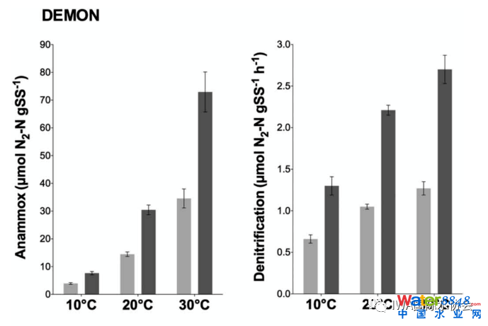 如下圖1所示,厭氧氨氧化和反硝化反應(yīng)顯示了溫度依賴性,在30°C時(shí)反應(yīng)速率最高,而且溫度對(duì)anammox菌影響更明顯—— 10°C的速率和30°C的速率相差近10倍