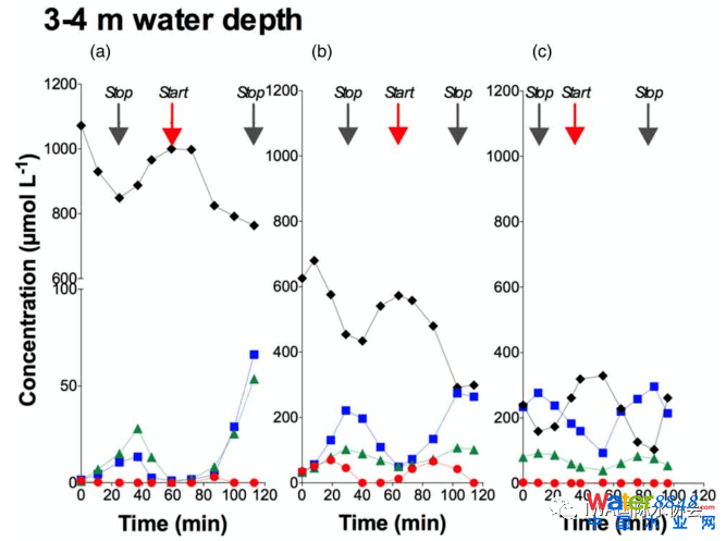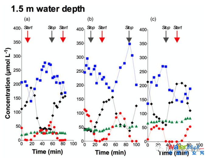 他們也想通過研究發(fā)現(xiàn)主流的厭氧氨氧化或反硝化作用是否會(huì)跟短程生物脫氮 (SBNR)相結(jié)合,例如DEMON工藝中的硝化-厭氧氨氧化反應(yīng)。所以他們也就主流的DO、氨氮、硝態(tài)氮和亞硝態(tài)氮進(jìn)行原位測量,分析氮轉(zhuǎn)化的情況。