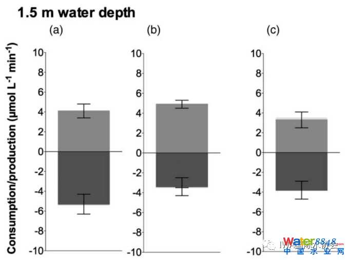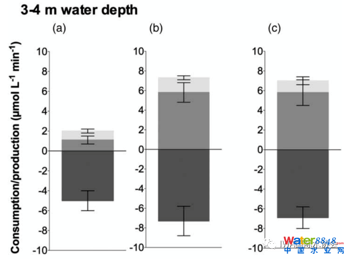 圖5. 硝化/反硝化池不同深度的氨氮凈消耗速率和硝態(tài)氮和亞硝態(tài)氮的生成速率情況。a/b/c分別指靠近、位于和遠(yuǎn)離曝氣區(qū)的情況