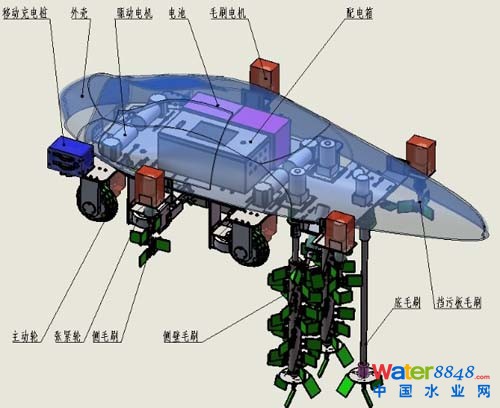 4、清洗機(jī)器人具有仿生功能,搖臂主毛刷隨輸水道外側(cè)漸開線池壁寬窄變化自動調(diào)整,使被清洗的曲線弧面更加干凈、徹底。
