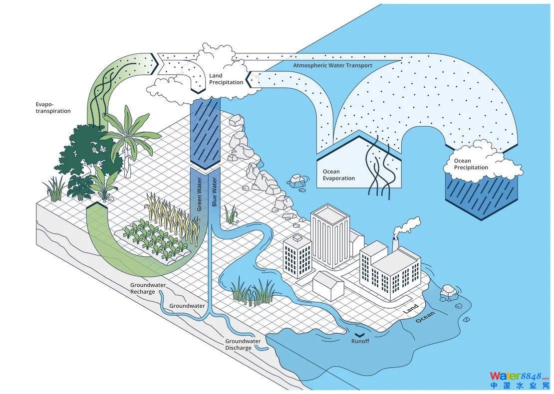 圖表展示了全球水循環(huán)中“綠水”和“藍(lán)水”的運(yùn)動(dòng)。圖片來源:全球水經(jīng)濟(jì)委員會(huì)