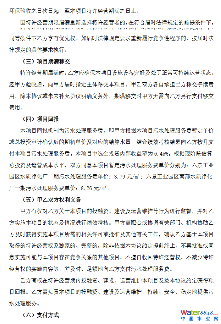 本項目回報機制為污水處理服務(wù)費,即甲方根據(jù)本項目污水處理服務(wù)費暫定單價或總投資審計確認后的期初單價及對應(yīng)的結(jié)算水量,結(jié)合績效考核結(jié)果向乙方按月支付本項目污水處理服務(wù)費。本項目中選全投資內(nèi)部收益率為6.45%。根據(jù)現(xiàn)階段估算總投資及運營成本水平,雙方同意本項目暫定污水處理服務(wù)費單價分別為:六景工業(yè)園區(qū)水質(zhì)凈化廠一期污水處理服務(wù)費單價:3.79元/m³;六景工業(yè)園區(qū)南部水質(zhì)凈化廠一期污水處理服務(wù)費單價:8.26元/m³。