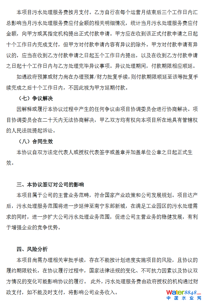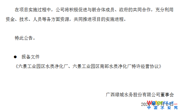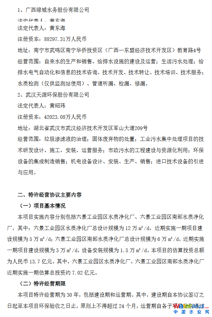 綠城水務(wù):簽訂六景工業(yè)園區(qū)水質(zhì)凈化廠、六景工業(yè)園區(qū)南部水質(zhì)凈化廠特許經(jīng)營協(xié)議