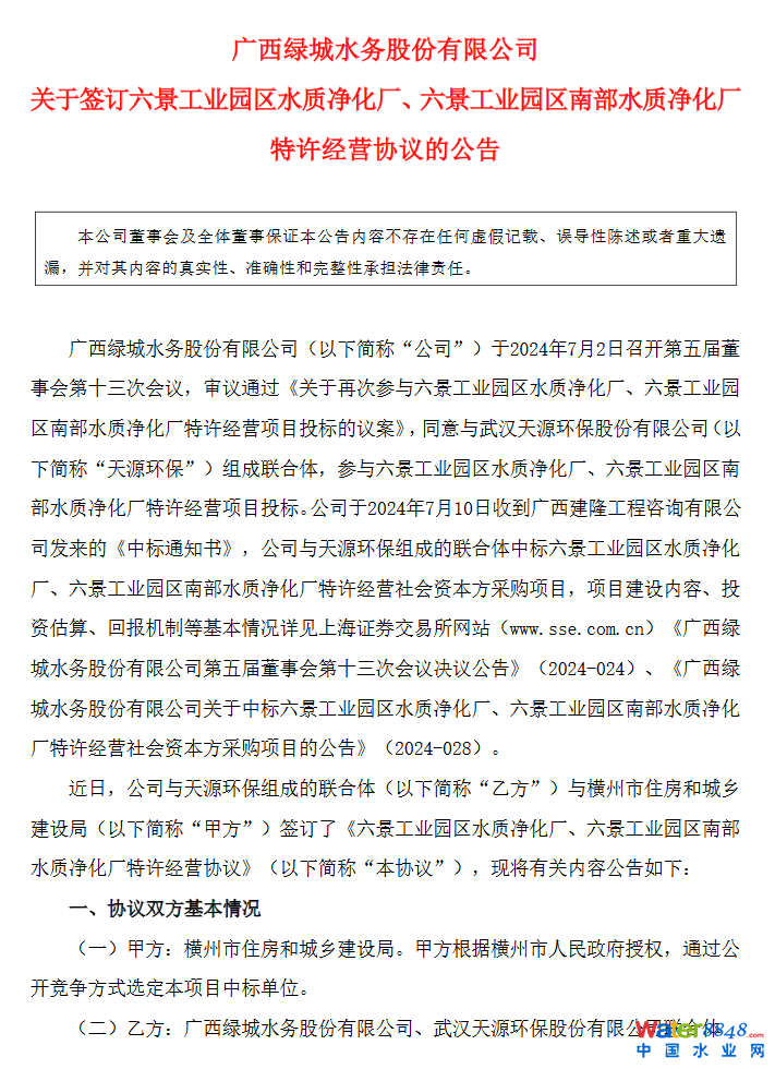 北極星水處理網(wǎng)獲悉,綠城水務(wù)公布,近日,公司與天源環(huán)保組成的聯(lián)合體(以下簡稱“乙方”)與橫州市住房和城鄉(xiāng)建設(shè)局(以下簡稱“甲方”)簽訂了《六景工業(yè)園區(qū)水質(zhì)凈化廠、六景工業(yè)園區(qū)南部水質(zhì)凈化廠特許經(jīng)營協(xié)議》。