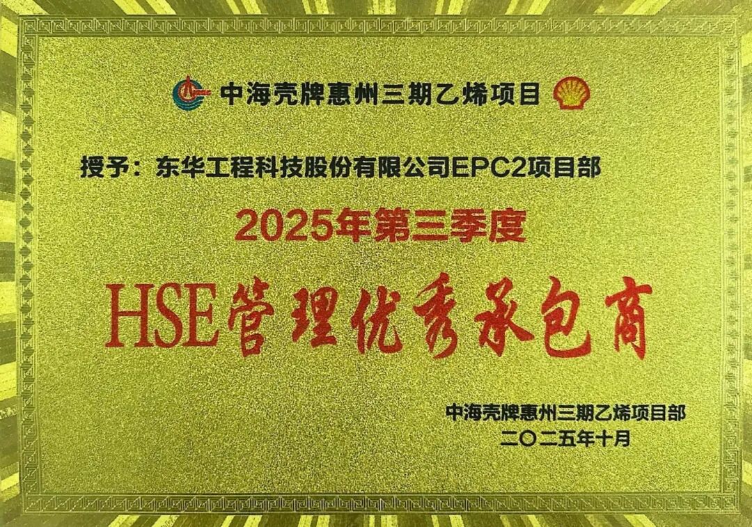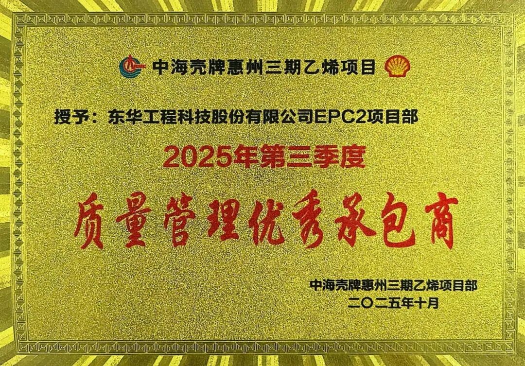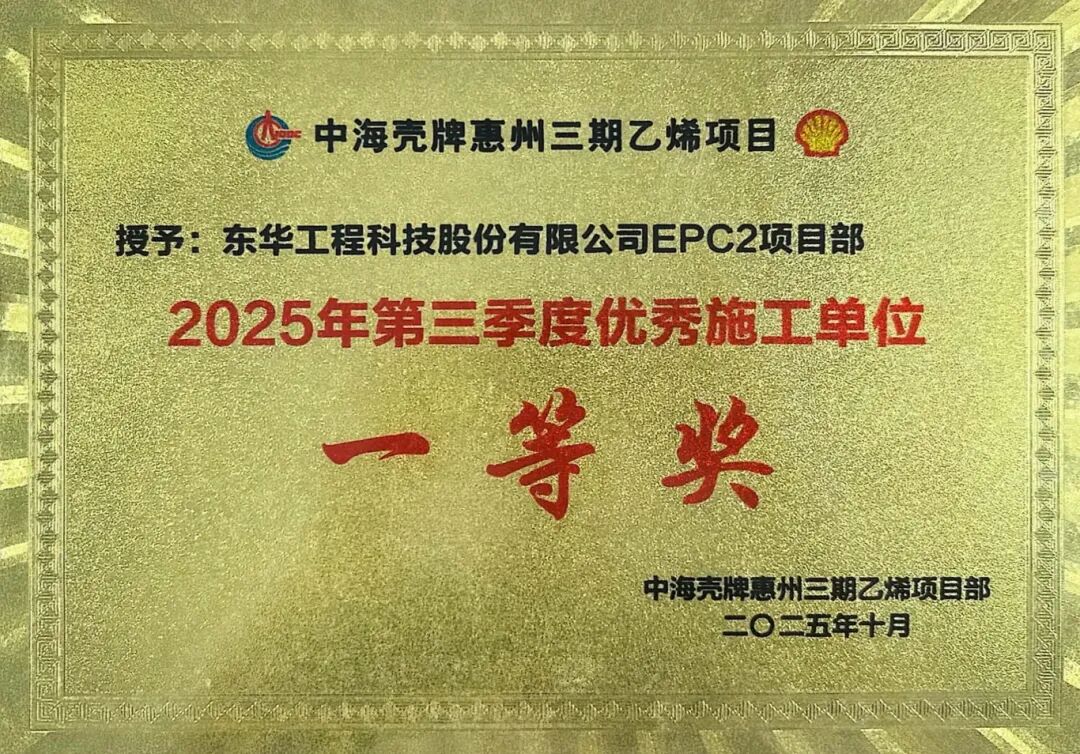 中國化學(xué)(601117)工程東華公司中海殼牌惠州三期乙烯項目污水場總承包工程項目部在業(yè)主組織召開的首次施工高層協(xié)調(diào)會中,榮獲2025年第三季度“優(yōu)秀施工單位一等獎”“質(zhì)量管理優(yōu)秀承包商”“HSE管理優(yōu)秀承包商”榮譽稱號。公司黨委副書記、總經(jīng)理孟陳周出席會議并作表態(tài)發(fā)言。 在項"/> 中國化學(xué)(601117)工程東華公司中海殼牌惠州三期乙烯項目污水場總承包工程項目部在業(yè)主組織召開的首次施工高層協(xié)調(diào)會中,榮獲2025年第三季度“優(yōu)秀施工單位一等獎”“質(zhì)量管理優(yōu)秀承包商”“HSE管理優(yōu)秀承包商”榮譽稱號。公司黨委副書記、總經(jīng)理孟陳周出席會議并"/>